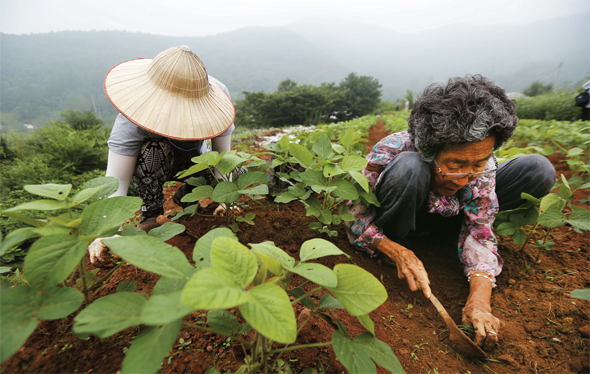 위양마을(밀양시 부북면) 주민 ‘덕촌 할매’(손희경씨)가 대학생 기자와 함께 콩밭을 매고 있다. 김명진 기자
