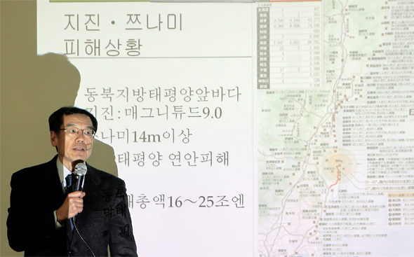 반 히데유키 일본 원자력자료정보실 공동대표가 2011년 4월5일 서울 중구 정동 프란치스코 교육회관에서 ‘후쿠시마 핵사고의 진실’을 주제로 강연하고 있다. 한겨레 이종근 기자