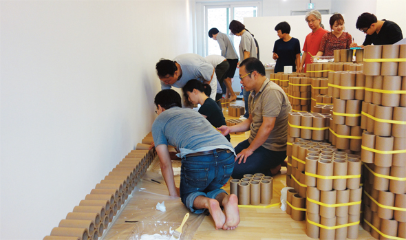 경기도 안산 고잔동의 한 상가건물 2층에서 20여 명의 건축가들이 지관통 5천여 개로 ‘이미지월’을 만들며 ‘세월호 기억저장소 1호’ 오픈을 위한 막바지 작업을 하고 있다. 아름다운재단 제공