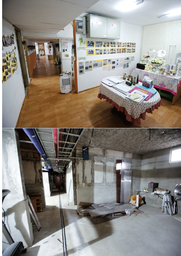 2000년대 이전에 지어진 아파트의 지하실은 대부분 창고로 쓰거나 그냥 방치해둔 실정이다. 지난해 문을 연 서울 도봉구 방학동 극동아파트 ‘햇살문화원’은 지하공간을 주민 커뮤니티 시설로 활용했다(위). 똑같은 구조지만 방치된 지하실(아래)과 대조된다.