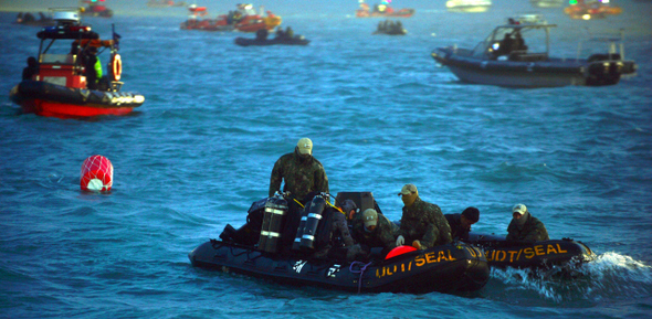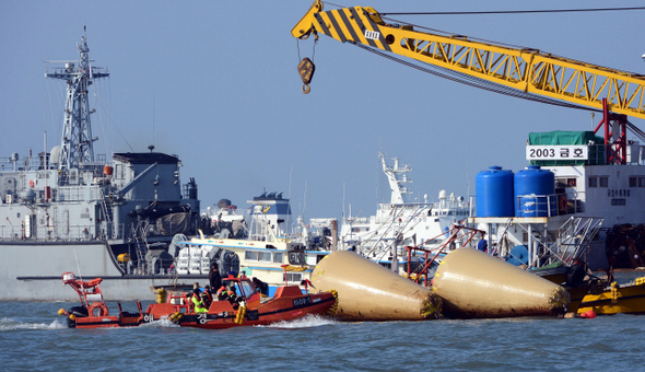 세월호 선원들은 “승객 구조는 해경의 몫”이라고 주장하지만 해양경찰은 “퇴선 조치는 선원들이 했어야 했다”고 반박한다. 세월호 침몰 사건이 발생한 전남 진도 앞바다에서 구조대원들이 수색·구조 작업을 벌이고 있다. 사진공동취재단