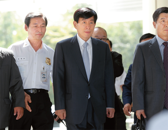 국가정보원의 정치·선거 개입 사건 판결을 정면 비판한 현직 판사가 법관윤리강령을 위반했다는 이유로 징계받을 처지에 놓였다. 지난 9월11일 원세훈 전 국가정보원장이 선고공판에 참석하기 위해 서울 서초동 서울중앙지법으로 들어가고 있다. 김명진 기자