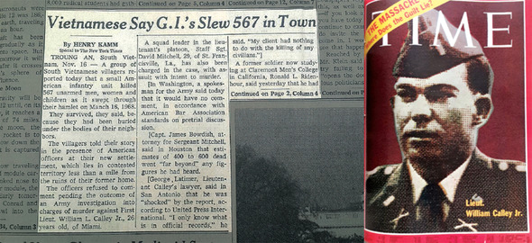 밀라이 사건을 최초로 특종 보도한 1969년 11월17일치 1면 기사(왼쪽). 최초 보도 땐 희생자 수를 567명으로 집계했다. 밀라이 사건의 주인공 중 한 명인 윌리엄 캘리 중위를 커버스토리로 다룬 시사주간지 . 퐁니·퐁넛은 해병 장교들 사이에서 ‘한국판 밀라이’로 불렸다. 고경태 제공