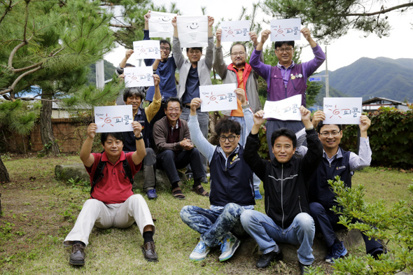 케이블 설치기사들과 판화가 이철수씨가 30일 오후 충북 제천 백운면 평동리 이철수 판화가의 집에서 ‘진짜 해피콜‘ 로고가 새겨진 종이를 들고 사진을 찍고 있다. 제천/김명진 기자 littleprince@hani.co.kr