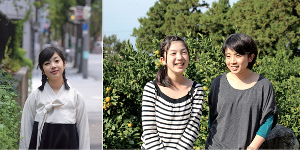 재일동포 4세인 강하나는 영화 〈귀향〉에 나오는 주요 출연자 중 가장 어리다. 영화에서 맡은 ‘정민’ 역의 옷을 입은 이 사진(왼쪽)은 영화 예비 포스터에 실렸다. 오른쪽은 하나씨가 제주 외할머니 댁에서 〈귀향〉에 같이 출연하는 엄마 김민수씨와 함께 웃는 모습이다. 두 모녀는 11월28~29일 일본 오사카에서 재일동포의 삶을 다룬 연극 무대에도 함께 오른다. 조정래 감독 제공, 송호진 기자