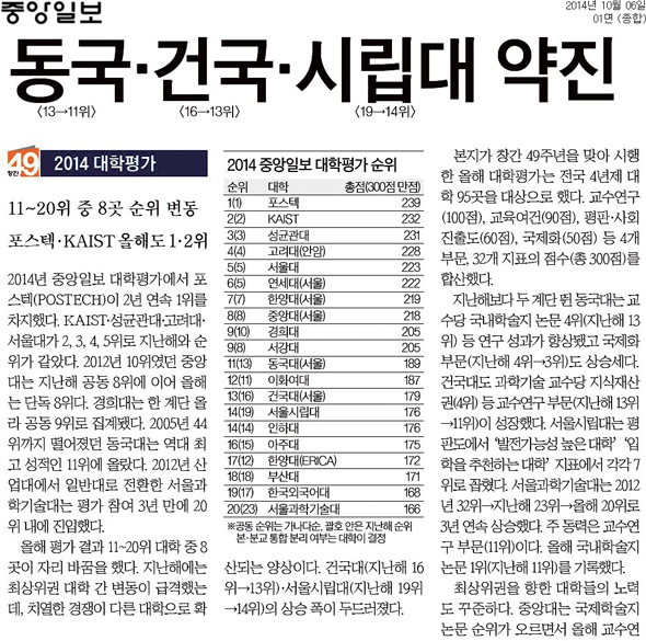 2014년 대학종합평가 결과를 담은 〈중앙일보〉의 10월6일치 1면 기사.