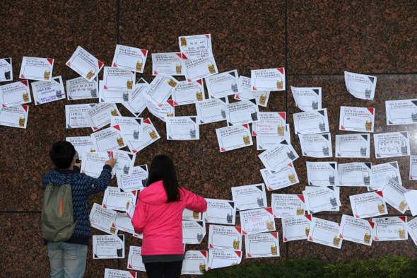 6일 오후 서울 중구 중앙일보사 앞에서 중앙일보의 대학종합평가 발표를 반대하는 대학생들이 기자회견 후 반대 메시지를 적은 종이를 외벽에 붙이고 있다. 류우종 기자 wjryu@hani.co.kr