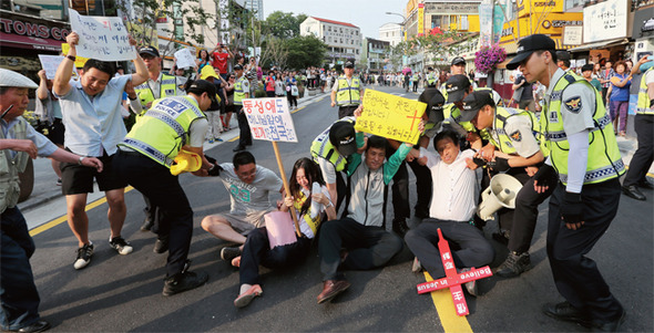 2014년 6월, 퀴어문화축제가 열린 서울 서대문구 연세로에서 동성애문제대책위원회 등이 동성애 확산 반대 등을 주장하며 행진 도로를 가로막았다. 한겨레 이종근 기자