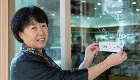 오미예 아이쿱소비자활동연합회 회장이 경기도 고양·파주 아이쿱생협 탄현점 출입문에 ‘진짜 해피콜’ 스티커를 붙이고 있다.