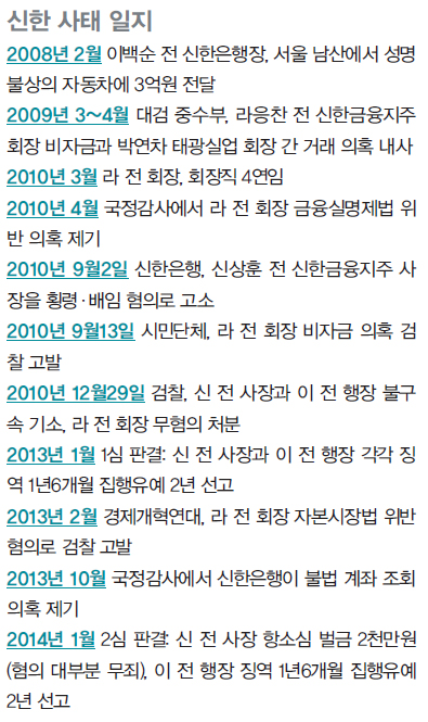 “라 전 회장이 처음 차명계좌 의혹이 나왔을 때 잘못을 인정하고 다 내려놨으면 사태가 이 지경까지 안 왔을 거다. 불쌍한 말단 직원들만 징계당하고 결국 내부 분열로 신한만 망가지지 않았나.” 전직 금감원 고위 관계자가 2010년을 회고하며 한 말이다. 검찰과 금감원, 국세청이라고 다를까? ‘라응찬 봐주기’로 첫 단추를 잘못 끼웠다는 사실을 인정하고, 이제라도 진실을 밝혀야 할 때다. 손바닥으로 가리기엔, 라응찬과 신한의 그림자는 너무 꼬리가 길다.