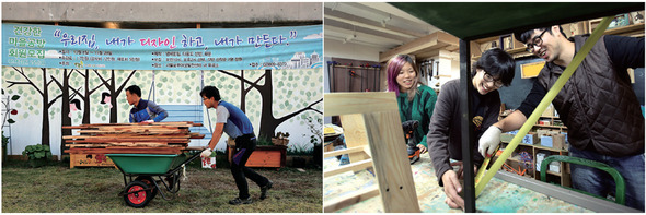 건강한 농부 협동조합이 만든 목공소 앞에서 동네에서 얻어온 폐자재 팔레트를 옮기는 사람들(왼쪽). 하자센터 목공방의 하다, 간올, 원스는 교육과 작업을 겸하며 목수의 길을 모색하고 있다.