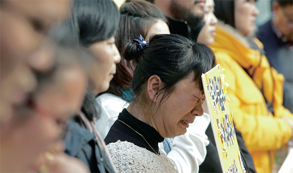 지난 11월5일 세월호 참사 유가족들이 76일간 머문 서울 청운효자동주민센터 앞 농성장을 떠나며 기자회견을 연 가운데 고 오영석 학생의 어머니 권미화씨가 눈물을 흘리고 있다. 김진수 기자