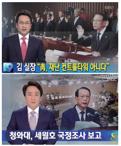 7월10일 세월호 국정조사에 출석한 김기춘 청와대 비서실장이 ‘청와대는 재난 컨트롤타워가 아니다’라는 요지로 “세월호 참사의 구조 책임자는 안전행정부 장관이지 대통령이 아니다”라고 발언한 내용은 SBS와 KBS에서 개별 보도로 다뤄졌고 다음날 신문들도 주요하게 다뤘지만, MBC <뉴스데스크>는 ‘청와대, 세월호 국정조사 보고’라는 자막으로 앵커가 읽는 두 줄짜리 단신으로 처리했다. 송광용 청와대 교육문화수석이 돌연 사퇴한 9월20일에도 SBS와 KBS가 주요 뉴스로 전한 반면, MBC는 단신조차 보도하지 않았다.