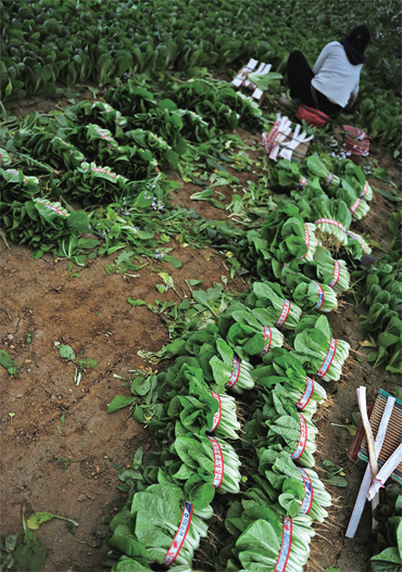 한 여성 농업 이주노동자가 밭에서 얼갈이배추를 뽑아 한 단씩 묶고 있다. 김정용 제공