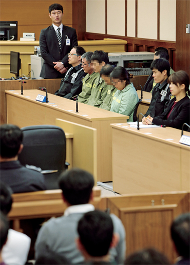 지난 11월11일 오후, 광주 동구 광주지방법원에서 이준석 선장 등 세월호 선원 15명이 피고인석에 앉아 1심 선고 결과를 기다리고 있다. 사진공동취재단