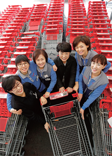 이경옥 전 이랜드일반노조 부위원장(오른쪽 세 번째)과 2007~2008년 이랜드 파업 당시 ‘홈에버’ 면목점 조합원으로 511일 동안 함께 싸웠던 여성 노동자들이 지난 10월22일 ‘카트’ 사이에서 환하게 웃고 있다. 정용일 기자