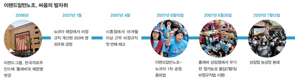 2007년 7월1일, 2년 이상 일한 계약직(기간제) 노동자를 정규직으로 전환해줘야 하는 이른바 ‘비정규직법’(기간제보호법)이 시행될 터였다. 외주화는 회사 쪽의 선제 대응이었다. 이랜드는 영악했다. ‘이윤이 최우선’이라는 자본의 논리에 철저히 따랐다. 외주화에 이어, 4월엔 홈에버 시흥점에서 18개월 이상 근무한 비정규직을 처음으로 해고했다. 18개월 이상 근무자는 고용보장을 하기로 한 노조와의 단체협약도 무시했다. 이랜드뿐만이 아니었다. 대다수 기업이 새로 시행되는 비정규직법의 적용을 받지 않기 위해 업무를 통째로 외주화해 외부 용역업체에 넘기거나, 근속 2년을 앞둔 비정규직을 해고했다. 영화 속 대사의 말마따나 “외주화는 트렌드”였고 “계약직은 파리 목숨”이었다.