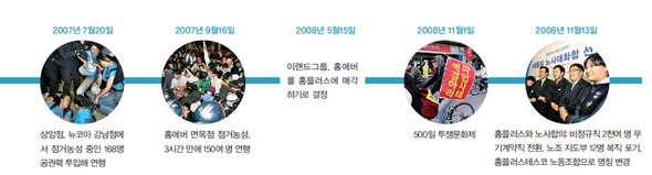 홈플러스에는 현재 2개의 노조가 존재한다. 이랜드일반노조가 전환한 홈플러스테스코노조와 홈플러스노조다. 노사갈등의 불씨는 이랜드 때처럼 타오르지만 않았을 뿐 잠복해 있다. 홈플러스는 비정규직과 ‘점오(0.5) 계약’을 맺는 방식으로, 하루 8시간을 근무시키면서도 7.5시간에 해당하는 임금만 지급하는 꼼수를 부려 올해 노조와 갈등을 빚은 바 있다.