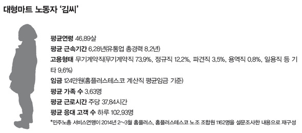 무조건 빨간 립스틱 바르라던 이랜드 황선영씨는 영화 <카트>의 주인공 선희처럼 대형마트에서 일하는 비정규직 노동자였다. 그리고 “저 생활비 벌러 나와요, 반찬값 아니고”라던 선희처럼 가족 생계비를 책임진 처지였다. 첫 직장은 무역회사였다. 둘째아이를 낳고는 육아 때문에 회사를 그만뒀다. 2003년 아이들을 데리고 서울 마포구 상암동 월드컵경기장에 산책을 나갔다가, 한국까르푸 상암점 채용공고 포스터를 발견했다. 기회는 우연히 찾아왔다. 사실 우연이 아니라 필연이었다. 재취업을 원하는 애엄마에게 대형마트는 최후의 보루다. 대한민국에서 애엄마를 흔쾌히 받아주는 몇 안 되는 직장이기 때문이다. 회사는 원서를 낸 다음날로 당장 출근하라고 했다. 남편이 퇴근하는 저녁 7시부터 황씨의 근무가 시작됐다. 처음엔 계산원으로 하루 5시간을 일했다. 그러다 고객센터로 자리를 옮겼고 근무시간은 8시간으로 늘었다. 그래봤자 월급은 90만원 안팎이었다. 2006년, 많은 것이 뒤틀어졌다. 남편의 사업이 어려워져 팔리지 않는 물건이 창고에 쌓여갔다. 한국까르푸는 이랜드그룹에 인수돼 ‘홈에버’로 이름을 바꿨다. 프랑스 자본이던 까르푸와 이랜드는 확실히 달랐다. 이랜드는 계산원들에게 무조건 빨간색 립스틱(영화에서는 진분홍색 립스틱)을 바르라고 강요했다. 그래야 이가 하얘 보이고 웃는 모습이 예뻐 보인다는 이유였다. 그리고 이듬해 1월, 이랜드그룹은 뉴코아 매장에서 계산원 350여 명을 외주화하기로 했다.