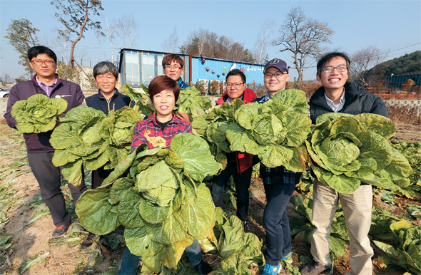 11월20일 오후 경기도 용인시 원삼면의 텃밭에서 김미화씨(앞줄)와 비정규직 설치·수리 기사들이 배추를 들고 서 있다. 왼쪽부터 정종문(LG유플러스지부), 박석훈(씨앤앰케이블방송지부), 천의봉(현대차 울산비정규직지회), 전승영(씨앤앰케이블방송지부), 장연의(SK브로드밴드지부), 박점규(비정규직없는세상만들기 집행위원)씨.