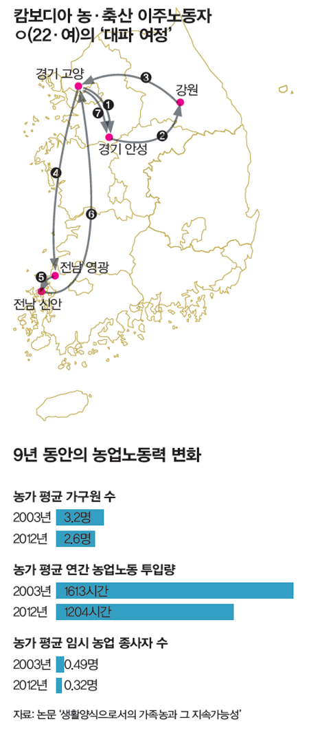 ③ 1~2인의 가족 노동력으로 감당할 수 있는 노동시간은 연간 1800시간 규모다. 고용노동력 확보가 절실한 농가는 연간 노동 투입이 1800시간이 넘는 중농 이상의 농가라고 할 수 있다. 1990년대 중반부터였다. 농업 구조조정과 농가 생존 방안의 하나로 영농 대형화가 제시됐다. 대형화가 옳은 길인지는 이견이 있다. 규모를 키워 수익을 내야 할 때도 인건비가 딜레마다. 생산비용은 뛰는데 농·축산물 가격은 떨어진다. 비용을 아끼려면 값싼 노동력에 눈을 돌릴 수밖에 없다. 농·축산업인들이 이주노동자를 찾는 이유다. 농·축산 분야 이주노동자는 2003년 923명 입국 이후 계속 늘어나고 있다. 2014년 9월 현재 등록 노동자는 2만3687명(여성은 7352명)이다. 전체 이주노동자 중 농·축산업 종사자 비율은 10%를 넘어섰다. 미등록 노동자까지 포함하면 3만 명이 넘을 것으로 추정된다. 대규모 시설채소 농가가 많은 경기도와 축산농가가 많은 충남에 각각 9068명(39.6%)과 3207명(14%)이 체류하고 있다.