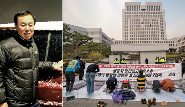 2009년 발생한 쌍용자동차 정리해고 사태가 6년을 넘기는 사이 해고노동자들의 생은 기약 없이 저물어가고 있다. 정리해고자 가운데 정년을 맞은 첫 조합원 김승태씨(왼쪽). 지난 11월11일 정리해고 2천 일을 맞아 서울 서초동 대법원 정문 앞에서 법원의 전향적인 판결을 촉구하며 2천배를 올리고 있는 금속노조 쌍용차지부 조합원들의 뒷모습. 엄지원 기자, 박승화 기자