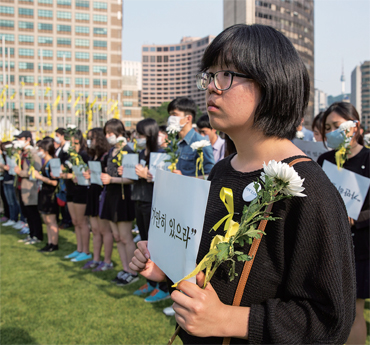 “가만히 있으라.” 지난 4월30일 마스크로 입을 가린 한 무더기의 청년들이 서울 명동·홍대입구·서울시청 앞 거리를 메웠다. 한 손에 국화를, 다른 한 손에 손팻말을 든 앳된 얼굴들이다. “가만히 있으라”던 어른들의 말 때문에 아이들이 스러졌다. 작은 체구의 여대생이 마이크를 손에 쥐었다. “100명이 넘는 사람이 아직도 차가운 바닷속에 있는데 우리는 ‘가만히 있으라’던 세월호 선장과 선원의 말처럼, 학교와 사회에서 배운 대로 가만히 있으면 되는지 묻고 싶습니다.” 세월호 추모 침묵시위를 처음 제안한 대학생 용혜인(24)씨다(제1010호 참조).