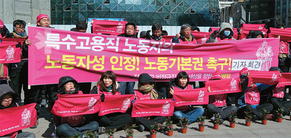 검찰이 ‘디엔에이 신원확인정보의 이용 및 보호에 관한 법률’을 기반으로 부당해고에 항의하는 과정에서 형사처벌을 받은 전·현직 학습지 교사들에게 DNA 시료 채취를 요구한 사실이 알려져 논란이 일고 있다. 2012년 학습지 교사 등 특수고용 노동자들이 노동권 인정을 촉구하는 모습. 한겨레 이정아 기자