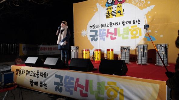 쌍용자동차 평택공장 굴뚝 밑에서 진행된 2014년 12월31일 ‘굴뚝 신년회’에서 지구지역행동네트워크 활동가 나영씨가 사회를 보고 있다. 이수현 인턴기자
