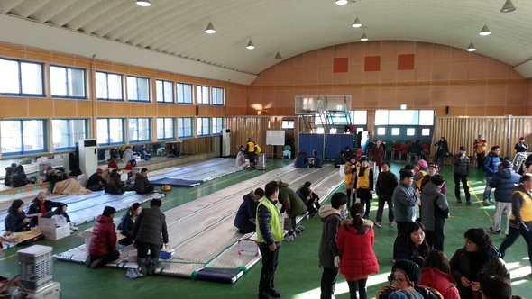 이날 저녁 8시20분께 대피소에는 병원에서 치료를 마친 부상자들이 돌아오면서 사람이 빠르게 늘어나고 있다. 사람들은 전기 난로와 스티로폼 돗자리, 모포 등으로 추위를 피하며 불안한 모습을 하고 있다.