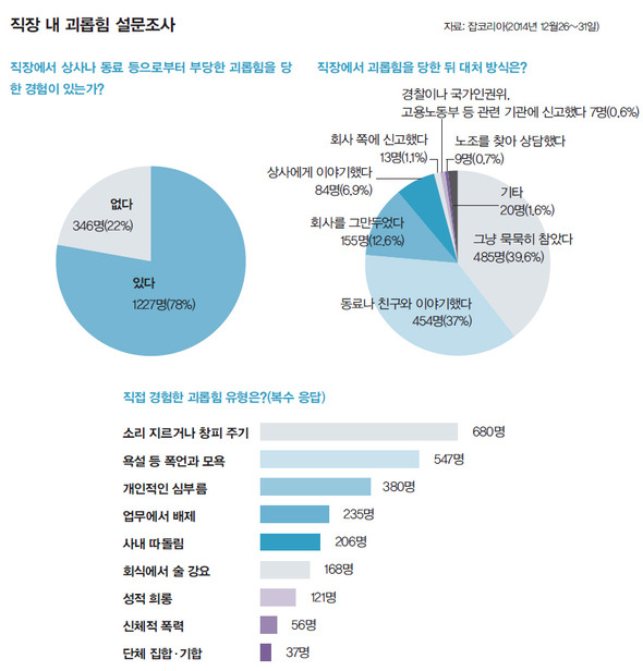 <한겨레21>이 취업 포털 잡코리아에 의뢰해 직장인 1573명을 대상으로 지난해 12월26일부터 12월31일까지 웹·모바일 설문조사를 한 결과, ‘직장에서 상사나 동료 등으로부터 부당한 괴롭힘을 당한 경험이 있다’고 답한 경우는 78%(1227명)에 달했다. 괴롭힘 유형(복수 응답)으로는 △소리를 지르거나 창피 주기(680명) △욕설 등 폭언과 모욕(547명) △개인적인 심부름(380명) △업무에서 배제(235명) △사내 따돌림(206명) △회식에서 술 강요(168명) △성희롱(121명) 등의 순이었다. 소수였지만 신체적 폭력(56명)으로 피해를 입었거나, 단체 집합 및 기합(37명)을 받았다는 경우도 있었다. 지난해 기업 리뷰 사이트로 접수된 내용 중에는 외부로 알려져 공론화되진 않았지만, 직장 내 인권침해 상황을 엿볼 수 있는 사례들이 있었다.