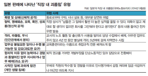 ■ 참고 문헌: ‘직장 내 괴롭힘 어떻게 볼 것인가’(노상헌·2013), <국제노동브리프> 2014년 9월호(한국노동연구원)
