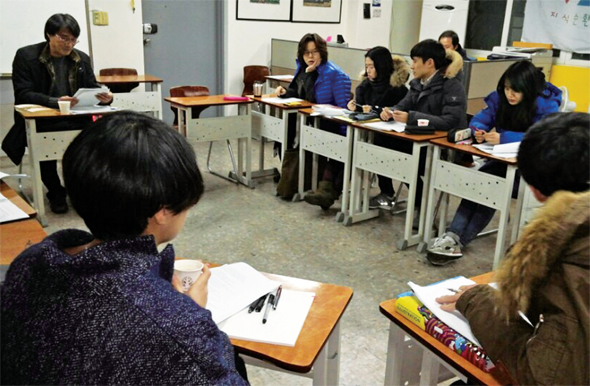 경쟁·취업률은 중요하지 않습니다 다른 지식공동체와 달리 지순협 대안대학은 ‘대학’이라는 틀을 유지한다. 발을 들이면 2년간 커리큘럼을 이수해야 한다. 출석 관리도 엄격하다. 2회 이상 결석하면 그 수업은 F를 면할 수 없다. 지순협 대안대학의 등장은 기존 대학에 대한 대안을 제시한다는 측면이 강했다. 현직 교수들이 대학 강단에서 느낀 문제의식이 반영됐다. 경쟁으로 얼룩진 교육을 지양하고 공감과 협력을 꾀하는 것이 지순협 대안대학의 취지다. 대개 8번의 강의 정도로 끝나는 대중 인문강좌와 달리, 체계적인 배움을 전하려는 움직임도 2년제 대안대학을 설립한 이유였다. 지순협 대안대학의 등록금은 월 30만원이다. 조합원들이 내는 조합비와 이 등록금이 지순협을 운영하는 자금이다. 현재 수강생 40명 중 80%는 20대다. 나머지 20%는 10대와 40~50대다. 고향이 전북인 박강산(22)씨는 서울로 유학을 왔다. 그는 “인문학·사회·과학을 아우르는 커리큘럼이 좋아서 지원했다. 이걸 다 배울 수 있다는 사실에 들떴다”고 입학 이유를 설명했다. 그는 학위를 따는 것보다 배우고 싶은 마음이 앞섰다. “대학원에 진학하려 하지만 필요한 학점은 학점은행제 등으로 채울 생각이라 별 걱정은 없다.” 뒤늦게 공부가 절실해져 지순협을 찾아온 이도 있다. 엄문희(44)씨는 “마흔이 넘었는데, 최근에 글을 쓰려다보니 생각의 기준이 없다는 느낌을 받았다”며 “다시 공부를 하고 싶었다. 원서 접수 마감 이틀 전에 허겁지겁 원서를 썼다”고 말했다. 지순협 대안대학의 선생들도 대안을 꿈꾸며 이곳을 찾았다. 지순협에서 담임교수를 맡고 있는 권민정(29)씨는 공업고등학교 미술 교사였다. 그는 “공업고등학교는 대학교처럼 취업률이 떨어지는 과는 폐과가 된다”며 “이런 현실들을 마주하다보니 갈등에 휘말렸다. 교육에서 이상이 없다는 것은 앞으로 나아갈 수 없다는 것”이라고 말했다. 그리고 “먹고사는 문제를 떠나서 가르치고 싶었는데 대안대학에서는 자신을 갉아먹지 않아도 될 것 같았다”고 덧붙였다. 지난 1월7일 오리엔테이션 날, 수강생들은 직접 ‘담임교수’를 뽑았다. 선생들은 앞에 나가서 “나를 담임교수로 뽑으면 ○○를 할 수 있다”고 홍보했다. 선생들이 자기소개를 하자, 학생들은 손을 들어 호응했다. 그러곤 자신을 지도할 담임교수를 손수 뽑았다. 담임교수들은 5~6명의 학생을 맡고 6개월 동안 학업 및 생활 전반을 관리한다. 학생이 자습을 하러 녹번동 강의실에 오면 담임교수도 함께 나온다. 개강일 오전, 자습을 하러 온 학생들 때문에 담임교수인 이묘우(42)씨와 권민정씨도 이른 아침부터 강의실에 나와 있었다. 지순협 대안대학은 2년 동안 얼굴을 마주하며 지식을 공유하는 대학이자 작은 공동체다. 앞으로 지순협의 강의실에서는 10대와 20대 그리고 40~50대가 한 교실에 모여 수업을 듣게 된다. 2년간 계속 얼굴을 볼 ‘학우’다. 오리엔테이션 날, 자기소개 자리에서 한 수강생은 광주민주화운동 당시의 경험을 이야기했다. 박강산씨는 “교과서에서만 보던 일을 직접 겪은 분과 함께 있어 신기했다”고 말했다. 엄문희씨는 “나이대가 내 또래일 줄 알았는데 젊은 사람이 많아 놀랐다”며 “획일화된 교육을 받지 않은 에너지를 느낄 수 있었다”고 했다. “단단하게, 즐겁게, 자유롭게” 오리엔테이션 날, 지순협 수강생들은 각자가 그리는 ‘대안대학’의 그림을 그렸다. 백지에 ‘지순협 대안대학’이라는 글자 테두리를 그리고, 알록달록하게 색을 입혔다. ‘지순협’ 글자 옆에는 나무, 사람, 지구 등 각자 중요하게 생각하는 ‘대안’의 가치들을 그렸다. 그려내지 못한 것은 글로 적었다. “잘 살아보세. 단단하게, 즐겁게, 건강하게, 지혜롭게, 자유롭게 배워나갔으면 좋겠다. 손에 손 잡고. 하하호호!” ‘대안대학’의 글자 옆에는 그림도 글도 없었다. 강정석씨는 수강생들과 그 백지를 채워갈 것이라고 말했다. 더 나은 삶이 무엇인지 ‘함께’ 고민하는 긴 여정이 막 시작됐다. 이수현 인턴기자 alshgogh0@gmail.com
