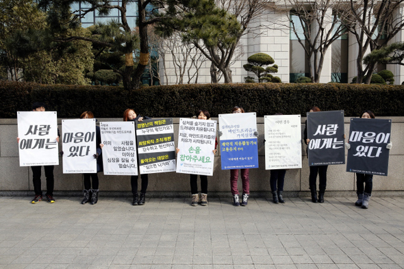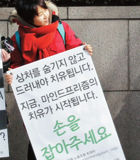 1월21일 저녁 8시 경기도 평택 쌍용자동차 공장 남문 앞. 굴뚝 위에 올라가 있는 이창근 금속노조 쌍용차지부 정책기획실장과 치유활동가 김미성(44)씨가 영상통화를 했다. 김씨는 닷새 전인 1월16일 1년간 일해온 심리치유기업 마인드프리즘에서 계약 종료 통보를 받았다. 2011년부터 쌍용차 노동자·가족 치유 공동체 ‘와락’과 쌍용차 노동조합이 만든 서울 대한문 분향소에서 해고자들의 마음을 돌보는 일을 해온 김씨는 “나도 이제 초보 해고자야”라고 말했다. 이날도 오전 9시 서울 역삼동 마인드프리즘 건물 앞에서 출근 시위를 하고 낮 12시30분 역삼역 앞에서 점심 시위를 한 뒤 서울 명동에서 환경운동가와 2시간 동안 ‘공감대화’를 마치고 평택으로 향했다. 이창근 실장, 김정욱 사무국장이 굴뚝에 올라간 뒤로는 일주일에 두세 차례 굴뚝을 찾는다. 마인드프리즘은 2004년 정신과 의사 정혜신씨가 세운 심리치유기업이다. 고문피해자 트라우마 치유, 쌍용차 해고노동자·가족 치유, 5·18 피해자들을 위한 심리치유 프로그램 등을 함께해왔다. 2013년엔 ‘대한민국 직장인의 마음이 건강해야 사회가 건강하다’는 내용의 ‘직장인 마음건강 캠페인’을 시작했다. 이 캠페인을 알리는 기자회견엔 정혜신씨와 김범수 다음카카오 이사회 의장이 함께 자리했다. 김범수 의장은 2012년 마인드프리즘의 지분 70.5%를 인수했다. 김 의장은 이 기자회견에서 “꿈꿀 수 있는 사회와 마음이 건강한 사회 두 가지를 삶의 목표로 삼았다. 1번 과제는 카카오톡을 통해서, 2번 과제는 마인드프리즘을 통해서 실현하겠다”고 말했다. 김 의장이 지분을 인수하고 차입금 형태로 투자하면서 마인드프리즘 조직은 커져갔다. ‘직장인 마음건강 캠페인’의 단초가 되는 ‘내마음보고서’ 개발도 시작됐고 직원도 9명에서 28명까지 3배로 늘어났다. 김미성씨도 이 과정에서 채용됐다. “당초 정규직으로 제안받았지만, 와락 활동을 겸해야 해서 1년 계약직으로 계약서를 썼어요. 계약 당시 회사는 ‘이건 형식일 뿐 기간은 신경 쓰지 않아도 된다’고 말했고요.” 지난해 7월부터 마인드프리즘에서는 권고사직·계약종료 등 노동자의 고용을 박탈하는 단어들이 경영진의 결정에 따라 통보되는 일이 생기기 시작했다. 7월20일께 김범수 의장의 친동생인 김화영 전 대표가 팀장 회의에서 ‘회사 사정이 어렵다’며 ‘직원 8명 권고사직 명단을 작성했다’고 말했다. 직원들은 경영 위기 극복 등을 함께 논의하자며 ‘직원대표단’을 꾸리고 논의 테이블을 만들었지만 경영진은 권고사직이 희망퇴직으로 마무리된 뒤부터 회의 테이블에 나오지 않았다. 그리고 계약직원 2명의 계약 종료에까지 이르렀다. 마인드프리즘 직원 10명은 계약 종료를 철회하라는 벽보를 붙였고 회사는 이들에게 ‘복무 규율에 충실하라’는 서면 경고장을 보냈다.