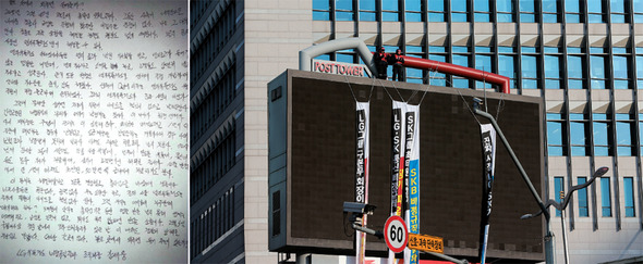 강세웅 LG유플러스 비정규직지부 조직부장과 장연의 SK브로드밴드 비정규직지부 연대팀장이 지난 2월6일 서울 중구 중앙우체국 옆 20m 높이의 광고탑에 올라 “원청이 파업 사태를 해결하라”고 요구하고 있다(오른쪽). 강세웅 부장이 고공농성에 나설 수밖에 없었던 이유를 손글씨로 써 〈주간 고공21〉에 보내온 편지. 왼쪽부터 강세웅 제공, 김진수 기자