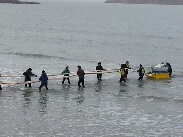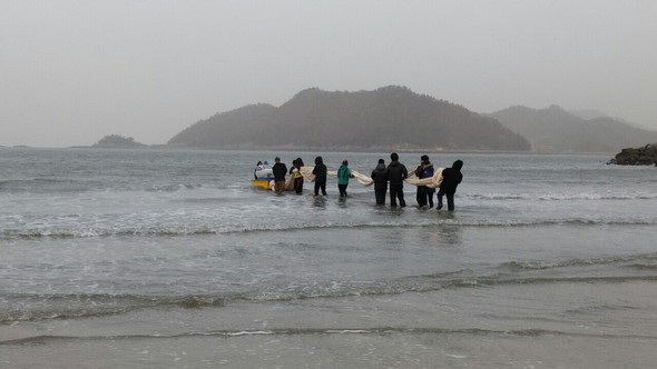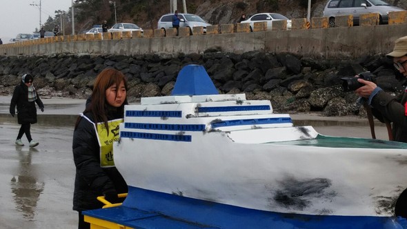 단원고 2학년 고 이승현군 누나 이아름씨가 세월호 모형배를 차가운 바닷물에 넣었다가 시민들과 함께 인양하고 있다. 정은주