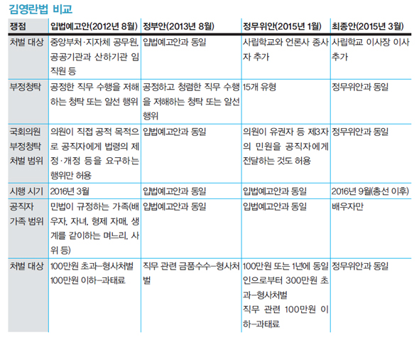 2013년 8월 정부가 국회에 넘긴 김영란법 정부안은 국회의원과 같은 선출직 공무원에게도 엄격했다. 공익 목적으로 ‘직접’ 공직자에게 법령의 제·개정을 요구하는 행위 등만 ‘부정청탁의 예외 사유’로 허용했다. 지역 유권자나 이익단체의 각종 ‘민원’을 받아 정부에 압력을 행사하는 관행을 뿌리 뽑기 위해서다. 그러나 국회는 원안에 없던 “선출직 공무원 등이 공익적 목적으로 제3자의 고충 민원을 전달하는 행위는 제재할 수 없다”는 예외 사유를 집어넣었다. 오경식 강릉대 교수(법학)는 “애초 입법 취지와 달리 정치인 등은 처벌하지 않는 불균형, 불평등한 법이 돼버렸다”고 비판했다.