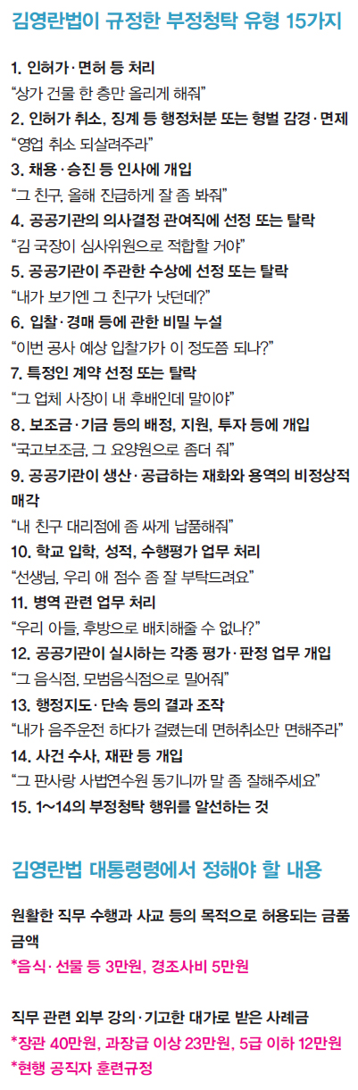 부정청탁에 대한 정의도 국회에서 바뀌었다. 정부안은 부정청탁을 ‘공정하고 청렴한 직무 수행을 저해하는 청탁 또는 알선 행위’로 정의했다. 대법원 판례로 부정한 청탁을 해석할 수 있기에 그렇게 포괄적으로 정했다. 다만 부정청탁에 해당하지 않는 예외 유형을 5가지 만들었다. 하지만 국회는 부정청탁 유형을 규정하는 열거주의로 변형했다. 불법을 포괄적으로 정하고 합법을 예외적으로 허용하는 정부안이 문제라고 했다. 부정청탁의 유형은 인허가, 처벌 감경, 인사·계약, 직무상 비밀 누설, 평가, 감사·단속, 징병검사 등 15가지로 좁혀졌다(62쪽 표 참조). 김주영 명지대 교수(법학)는 “부정청탁에 열거한 15가지 이외의 행위는 해도 괜찮은가”라고 되물었다. 송기춘 교수도 “부정청탁을 열거할 수 있는 것인지 의문”이라고 동의했다. “공직의 청렴성 확보, 공직 신뢰라는 입법 목적을 달성하려면 부정청탁 행위를 열거한 방식보다 부정청탁을 정의한 정부안이 보다 타당성이 있다.”