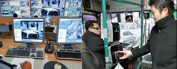 서울 강남경찰서 역삼지구대의 방범용 폐회로텔레비전(CCTV) 관제센터 모니터에 비친 강남 거리의 모습(왼쪽). 한 시민이 서울 시내버스에 올라 교통카드로 요금을 내고 있다. 한겨레 이종근 기자, 한겨레 이정아 기자