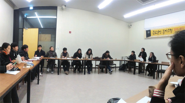 서울 중구 정동 프란치스코 회관에서 3월6일 금요일 〈금요일엔 돌아오렴〉 깊이 읽기 모임이 열렸다. 오른쪽에 서 있는 이가 정원옥 〈문화과학〉 편집위원. 〈금요일엔 돌아오렴〉 작가기록단 제공