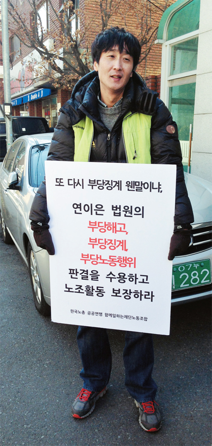 1인시위를 하고 있는 김창주 함께일하는재단노동조합 위원장. 함께일하는재단노동조합 제공
