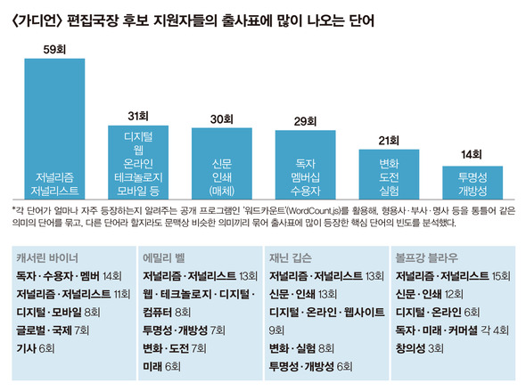 후보 지원자들은 어떤 비전을 출사표에 담았을까. 각각 1천 단어 안팎으로 쓰인 4명의 출사표를 살펴보니, 공통적으로 △정확성·공정성을 갖춘 <가디언>의 저널리즘 전통을 옹호하는 동시에 △디지털 미래 전략(기존 인력의 디지털 적응 및 새 인력 영입 필요성 등)에 대한 개방적이고 투명한 내부 논의를 강조했으며 △독자·수용자와 소통을 넓히고 젊은 세대와의 접점을 찾을 수 있는 방안 마련 필요성 △<가디언>의 지역 확장, 세계적 영향력 확대 필요성 등을 제시하고 있다.
