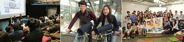 ‘명랑 마주꾼’은 영구임대아파트를 살고 싶은 곳으로 만들기 위해 명랑하게 뛰어다닌다. 왼쪽부터 다큐멘터리 〈경한 아저씨, 안녕〉 상영회, 마포의 1인 가구를 찾아가 생활수리를 해주는 ‘명랑 수리공’들, 동네에서 여행하며 영상을 찍는 ‘명랑 여행자’ 청년 모임의 다큐상영회. 우민정 제공