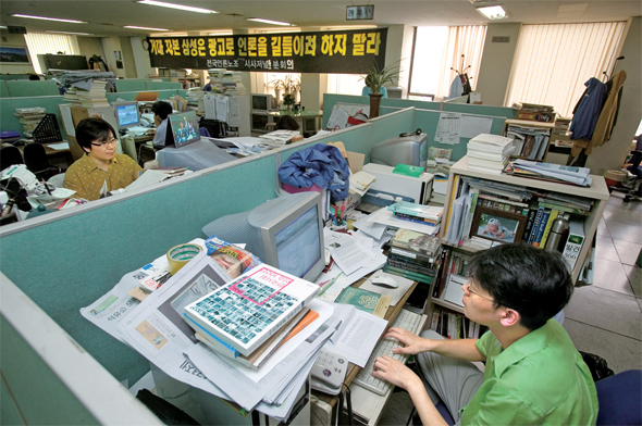 2006년 사장의 삼성 관련 기사 삭제에 항의하는 플래카드를 내건 사무실에서 일하고 있는 〈시사저널〉 기자들. 이 일로 편집국장이 사표를 냈다. 박승화 기자