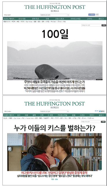 이날 <허핑턴포스트 코리아>가 마지막으로 선택한 스플래시에는 종합편성채널 JTBC가 드라마 <선암여고 탐정단>에서 내보낸 여고생들의 키스신 이미지가 들어갔다. 헤드라인 카피는 ‘누가 이들의 키스를 벌하는가’. 방송통신심의위원회는 이날 해당 드라마를 심의하면서 동성애 혐오 발언을 쏟아냈고, 중징계를 예고했다.