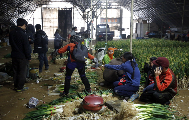 검은 차광막을 두른 가건물 창고 앞에 승합차와 25인승 버스가 서 있었다. 창고 옆 밭에선 수확철을 맞은 굵은 봄대파들이 하늘을 치받았다. 뱀 허물처럼 벗겨진 대파 껍질들이 밭 주위로 수북했다.