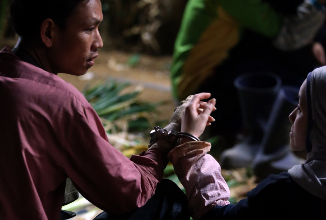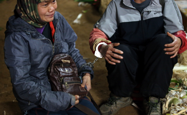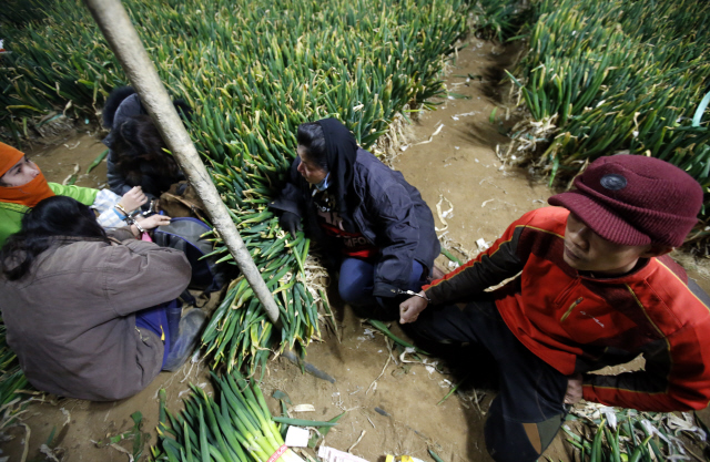 대파 작업을 하던 미등록 이주노동자들이 정부 합동단속반이 채운 수갑을 차고 한 곳에 모여 있다.