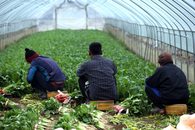 아내가 단속반에 체포된 타이 노동자(가운데)가 비닐하우스에서 열무 작업을 하고 있다.