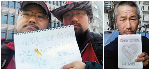 하늘 노동자들이 세월호 가족 응원 메시지를 사진으로 찍어 <주간 고공21>에 보내왔다. 고공의 노동자들이 하루하루 몸에 쌓아온 고통은 세월호 가족들이 1년 동안 심장에 쌓아온 고통과 멀지 않다. “세월호는 한국 사회 자본과 권력의 실체를 보여주는 총체”라고 차광호는 말했다. “세월호의 진상이 규명되는 사회가 돼야 노동자들이 하늘에 오르지 않는 사회도 온다.” 그는 “진실을 인양하자”고 수첩에 썼다.