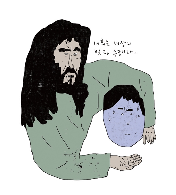 그러나 현대사회의 인간관계를 지배하는 규범이 과연 ‘빛과 소금’일까? 나는 ‘빛과 소금’이 아니라 ‘빚과 수금’이라는 규칙이 사람과 사람이 만나는 방식을 지배하고 있지 않나 생각해본다. 말하자면 이제 이 세상의 사람들은 빚진 자와 수금하는 자로, 고통을 받는 자와 고통을 주는 자로 나뉘게 된 것이다.